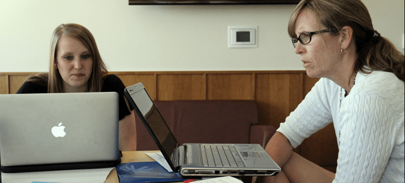 Kristina Smith and Sabra Miller discuss the new state math standards during a June training at Fort Lewis College. (Photo: Jackie Mader)